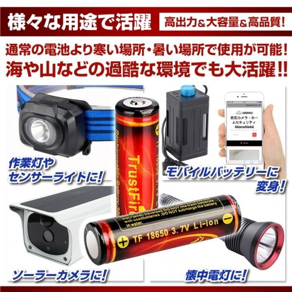 TrustFire(トラストファイヤー)社製の純正品でPSE(電気用品安全法)の技術適合検査をクリアした、18650規格の3400mAhリチウムイオン充電池です。一般的な18650充電池は、直径18mm・長さ65mmの大きさですが、こちらの充電池は過充電・過放電を防ぐPCB保護回路(Protection Circuit Board)付きの為、直径は18mmですが、長さが4mmほど長い69mmの大きさです。